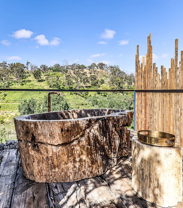 Teetering on the brink of a dramatic ravine with postcard views, Precarious exudes industrial elegance and epitomises the very best in luxury accommodation from the Winner of Australia’s No.1 Unique Accommodation. The striking views and otherworldly serenity can’t help but stir your soul. Find your calm in the stunning 20 Million year old petrified stone bath brought to life by the rivers and volcanos of Indonesia, on a private platform overhanging the verge of the ravine in an incredibly picturesque setting.