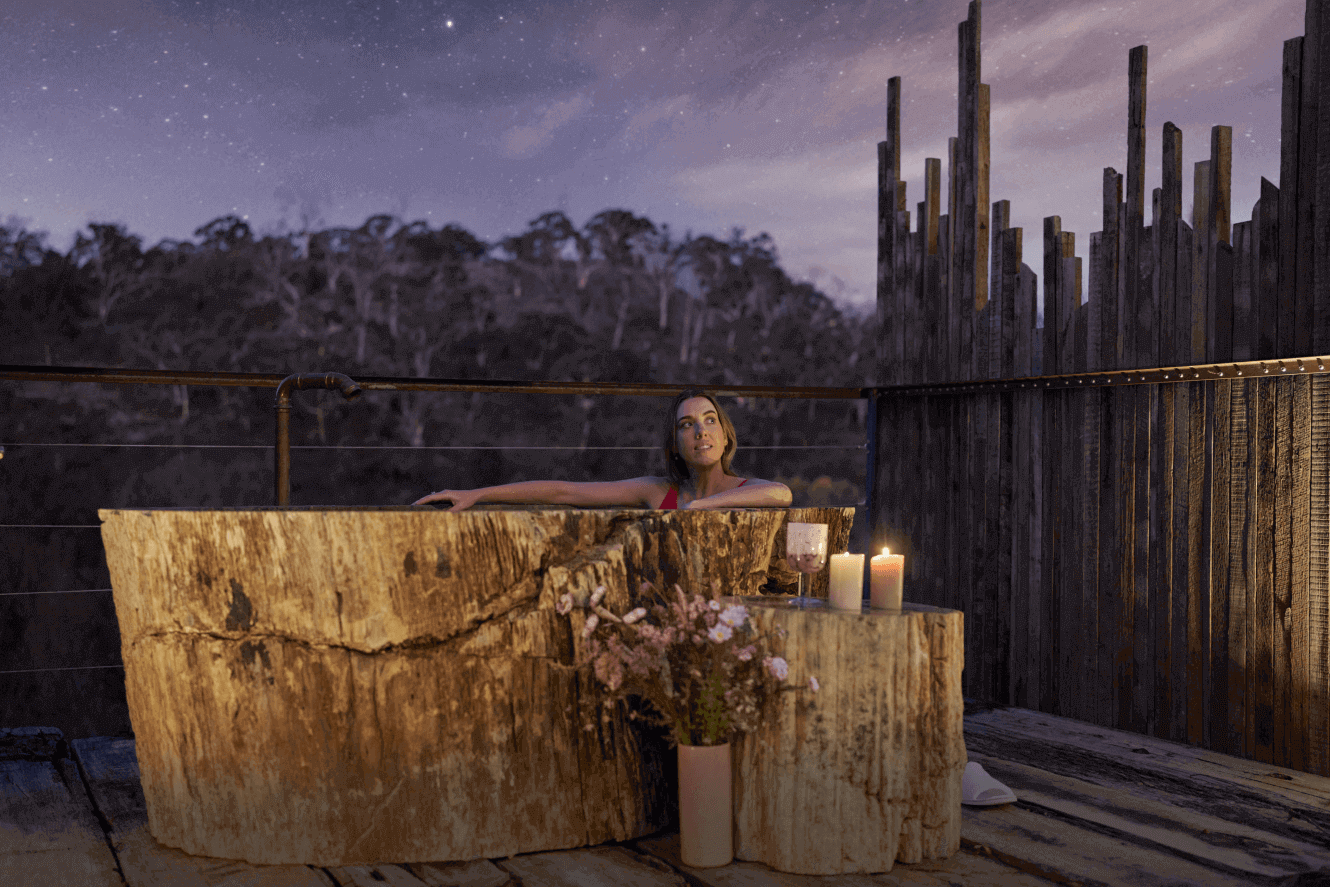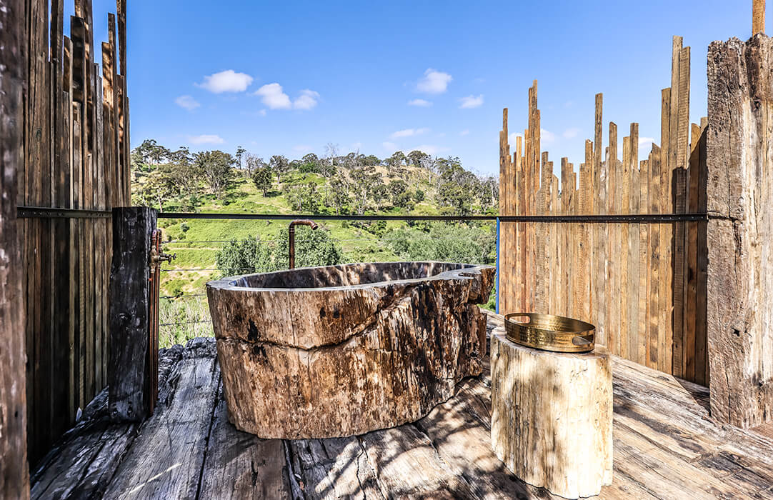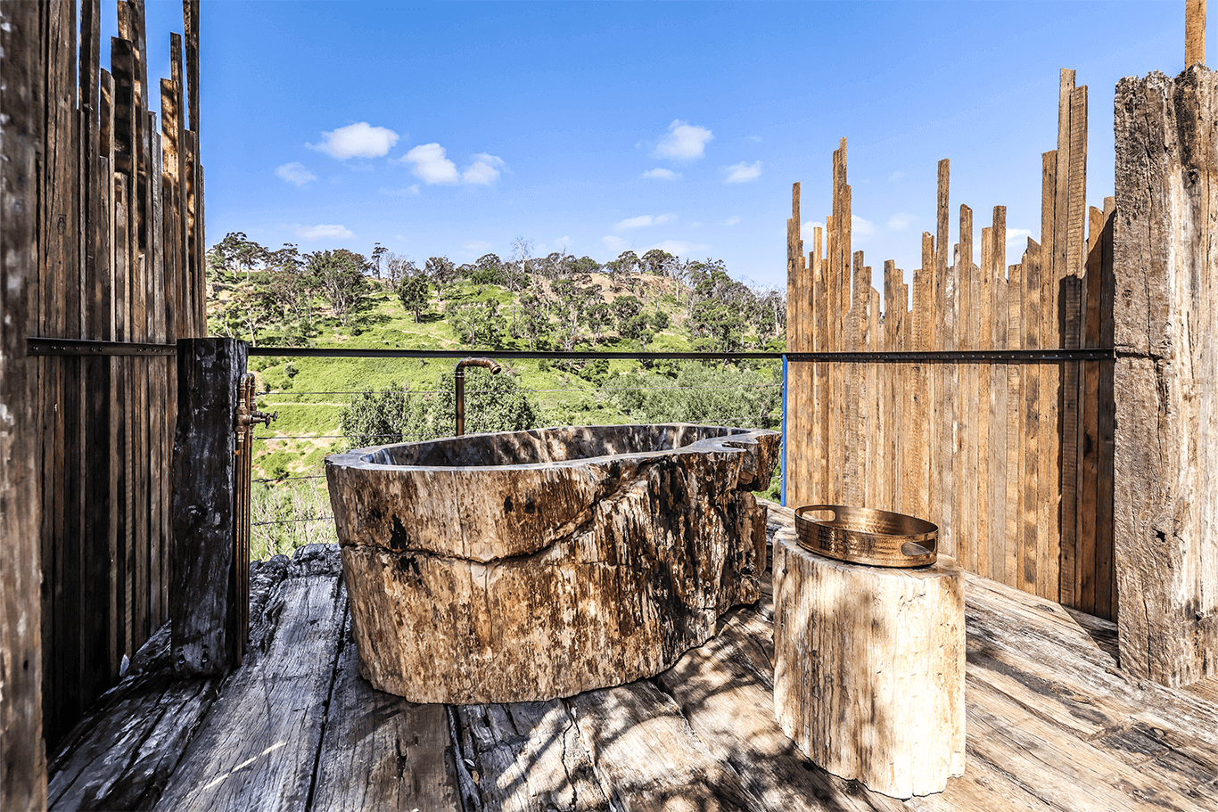 Teetering on the brink of a dramatic ravine with postcard views, Precarious exudes industrial elegance and epitomises the very best in luxury accommodation from the Winner of Australia’s No.1 Unique Accommodation. The striking views and otherworldly serenity can’t help but stir your soul. Find your calm in the stunning 20 Million year old petrified stone bath brought to life by the rivers and volcanos of Indonesia, on a private platform overhanging the verge of the ravine in an incredibly picturesque setting.
