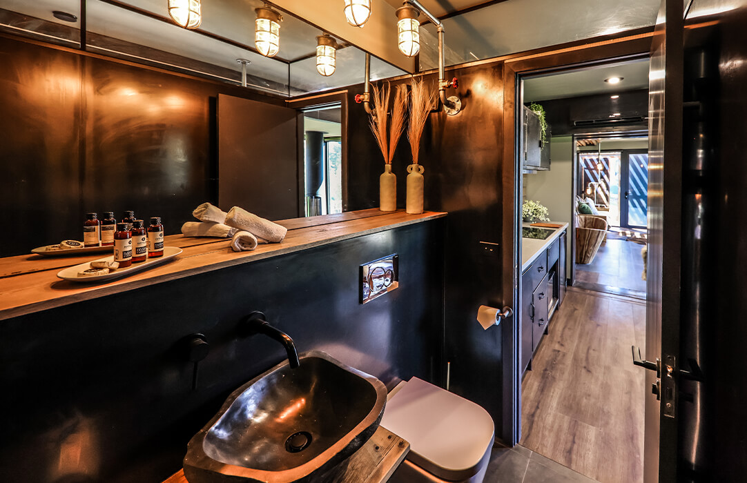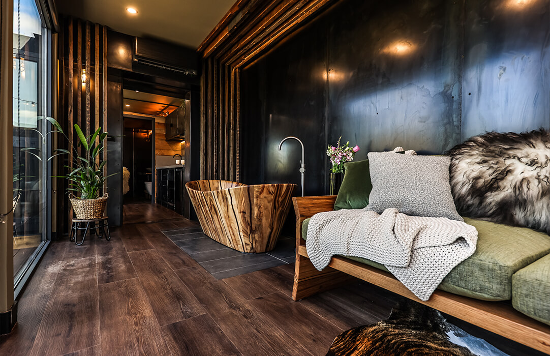 The only accommodation of its kind. From the world’s only camphor laurel bath with fibre optic lighting in the walls, to the exotic industrial pipe lighting, private cliffside deck, indoor and outdoor baths, moody design vibe and hellishly sexy private wellness precinct.